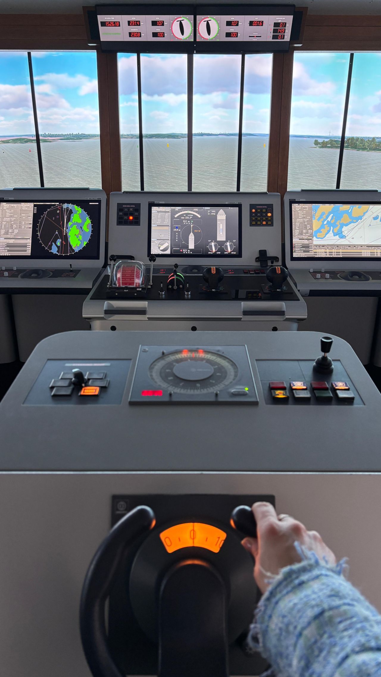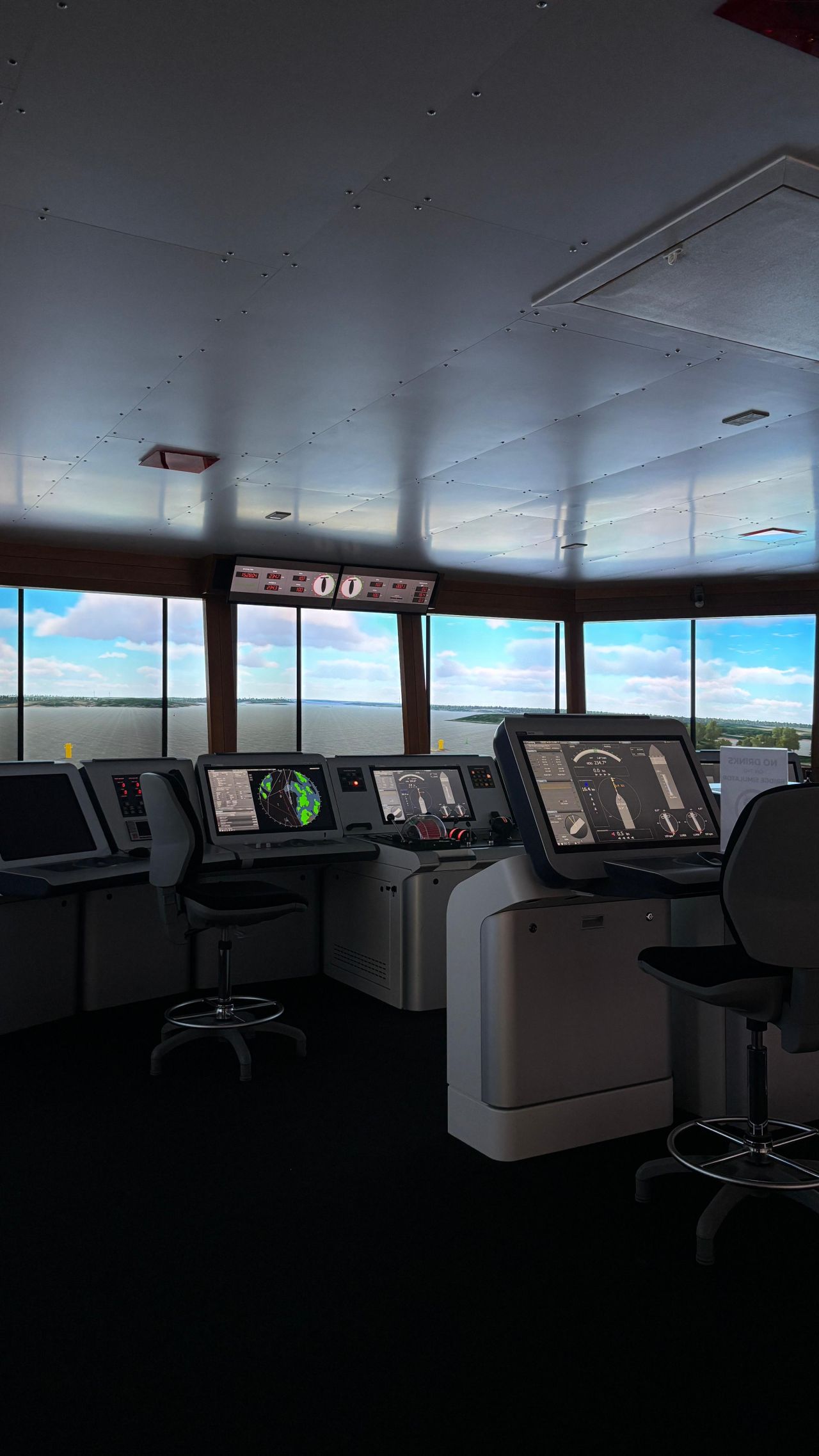 Besonders hervorzuheben sind die installierten 105-Zoll Ultra-Wide Displays, die eine beeindruckende Panoramaansicht ermöglichen und das visuelle Zentrum der Simulatorbrücke bilden.