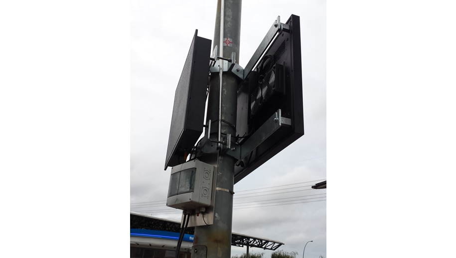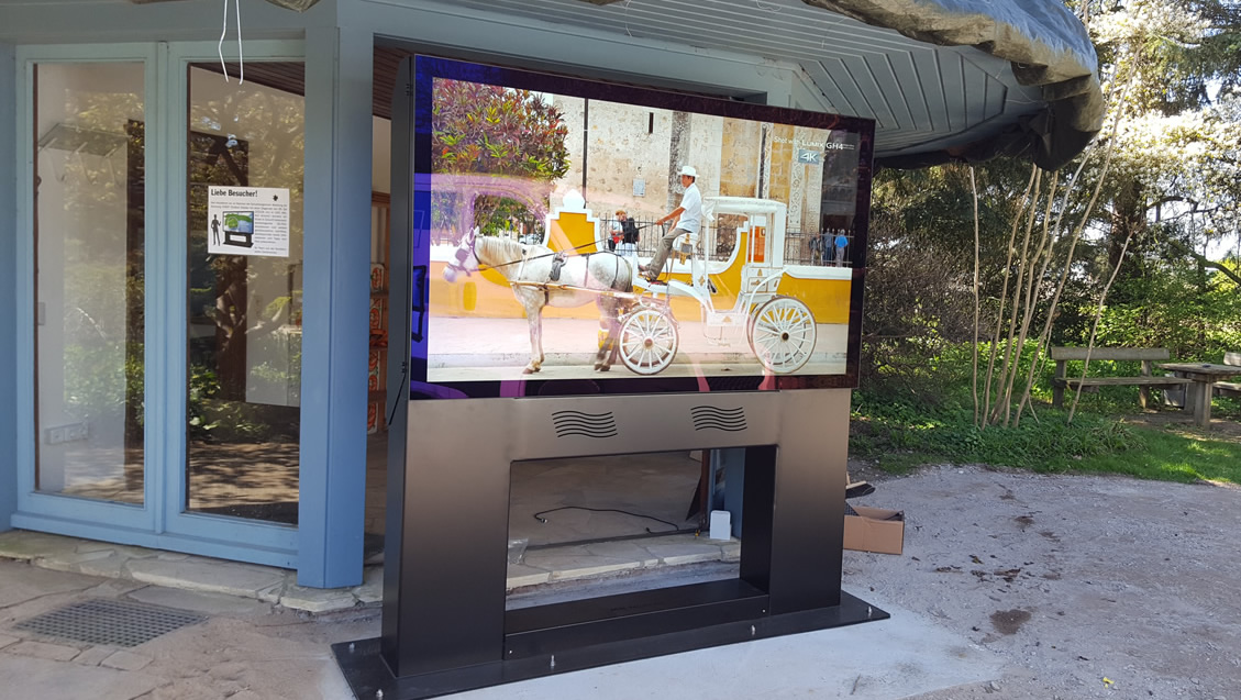 Durch eine Sonderanfertigung konnte dieses 75 Zoll Display an einer Werbepilone angebracht werden